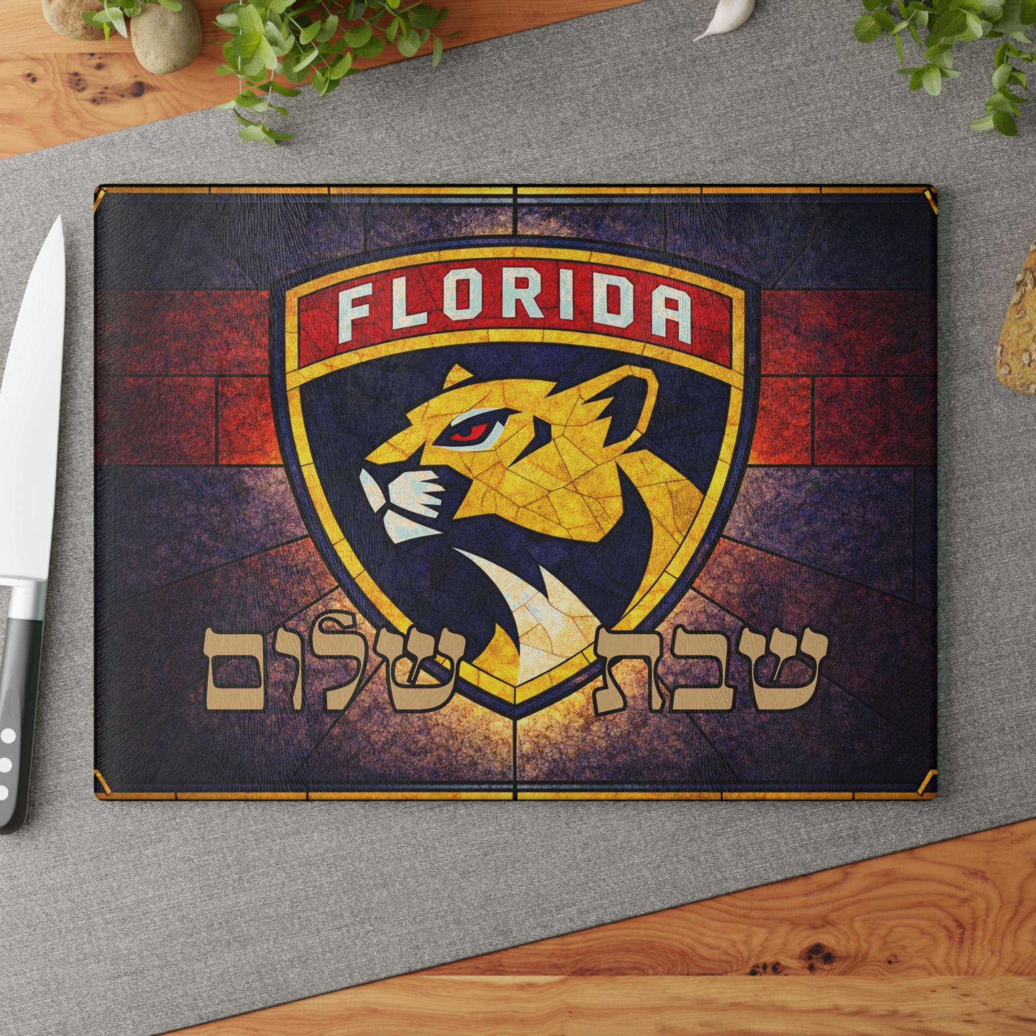 Florida Panthers challah board for the Jewish hockey fan who wants their team pride on the Shabbat table. This 15x11 tempered glass Shabbat cutting board blends Florida Panthers energy with meaningful Friday night tradition.