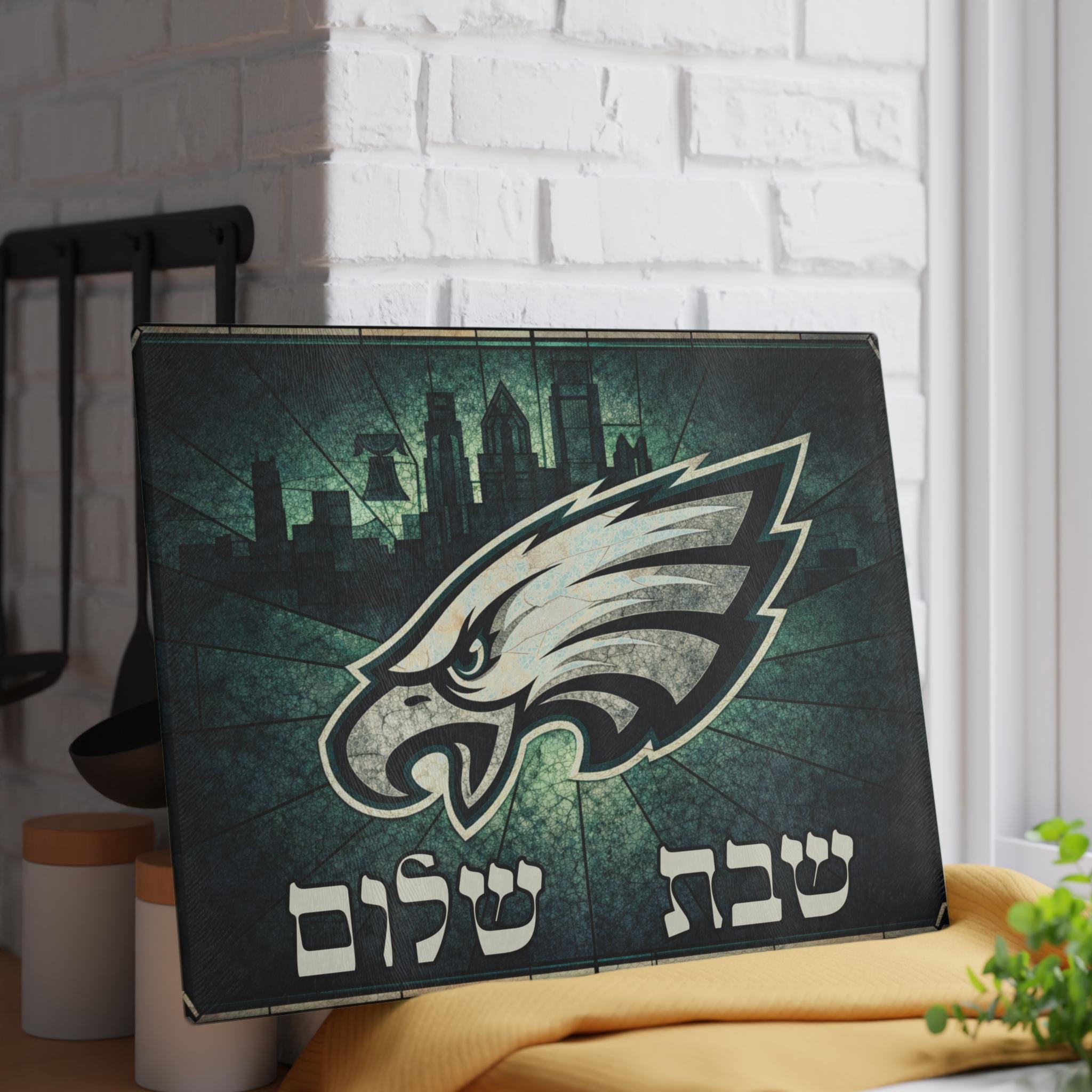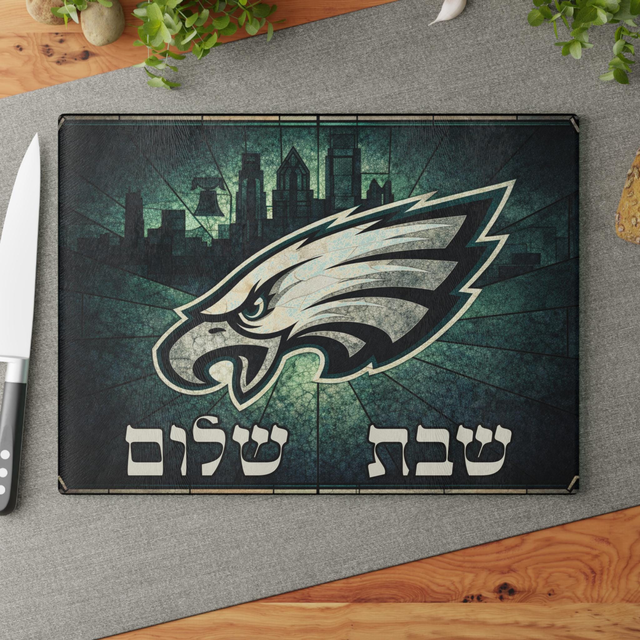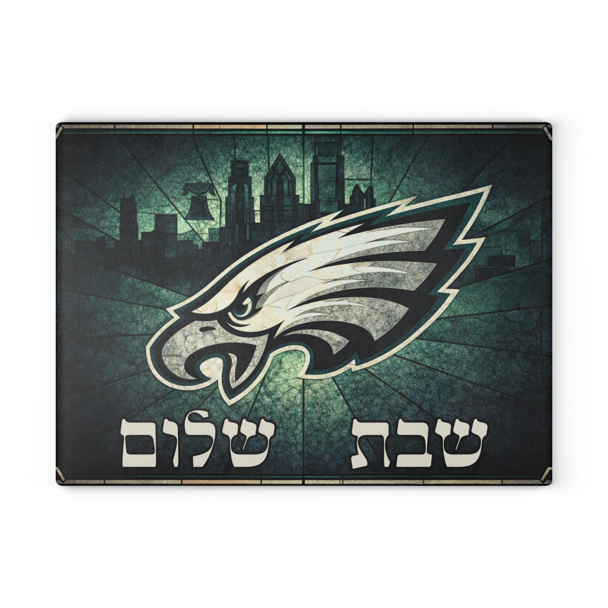 Philadelphia Eagles challah board for the Jewish football fan who brings team pride to the Shabbat table. This 15x11 tempered glass cutting board blends Eagles spirit with meaningful Judaica for a bold, conversation-starting centerpiece.