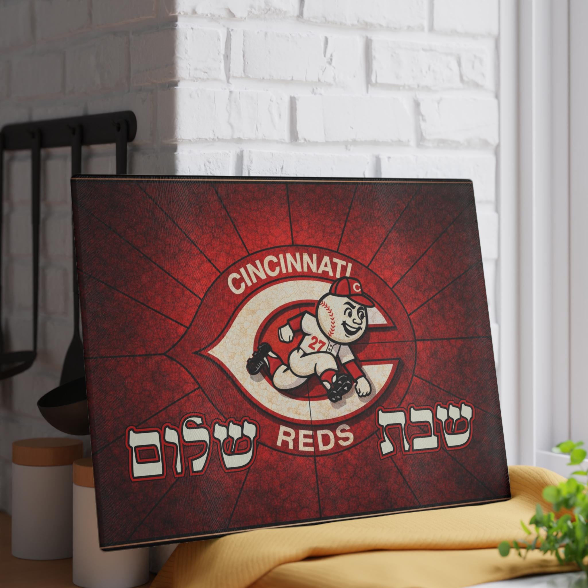 Cincinnati Reds old school logo challah board designed for Jewish baseball fans who want their team pride at the Shabbat table. This 15x11 tempered glass cutting board blends classic Reds nostalgia with meaningful Judaica for a statement piece that feels personal and elevated.
