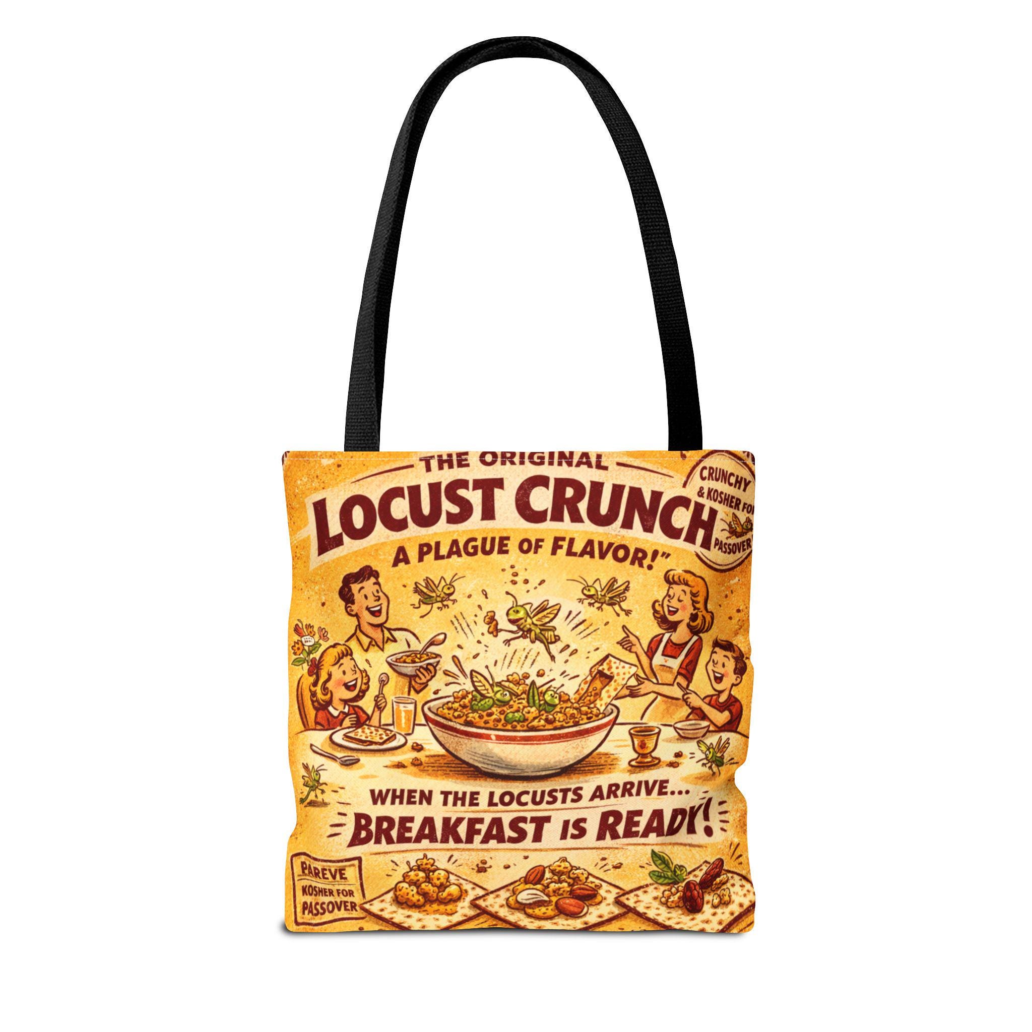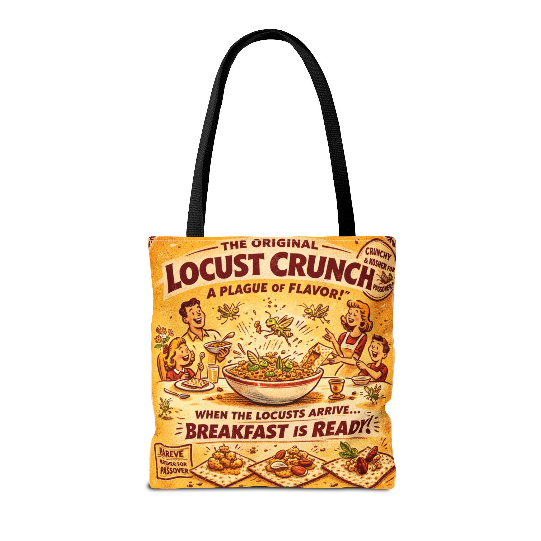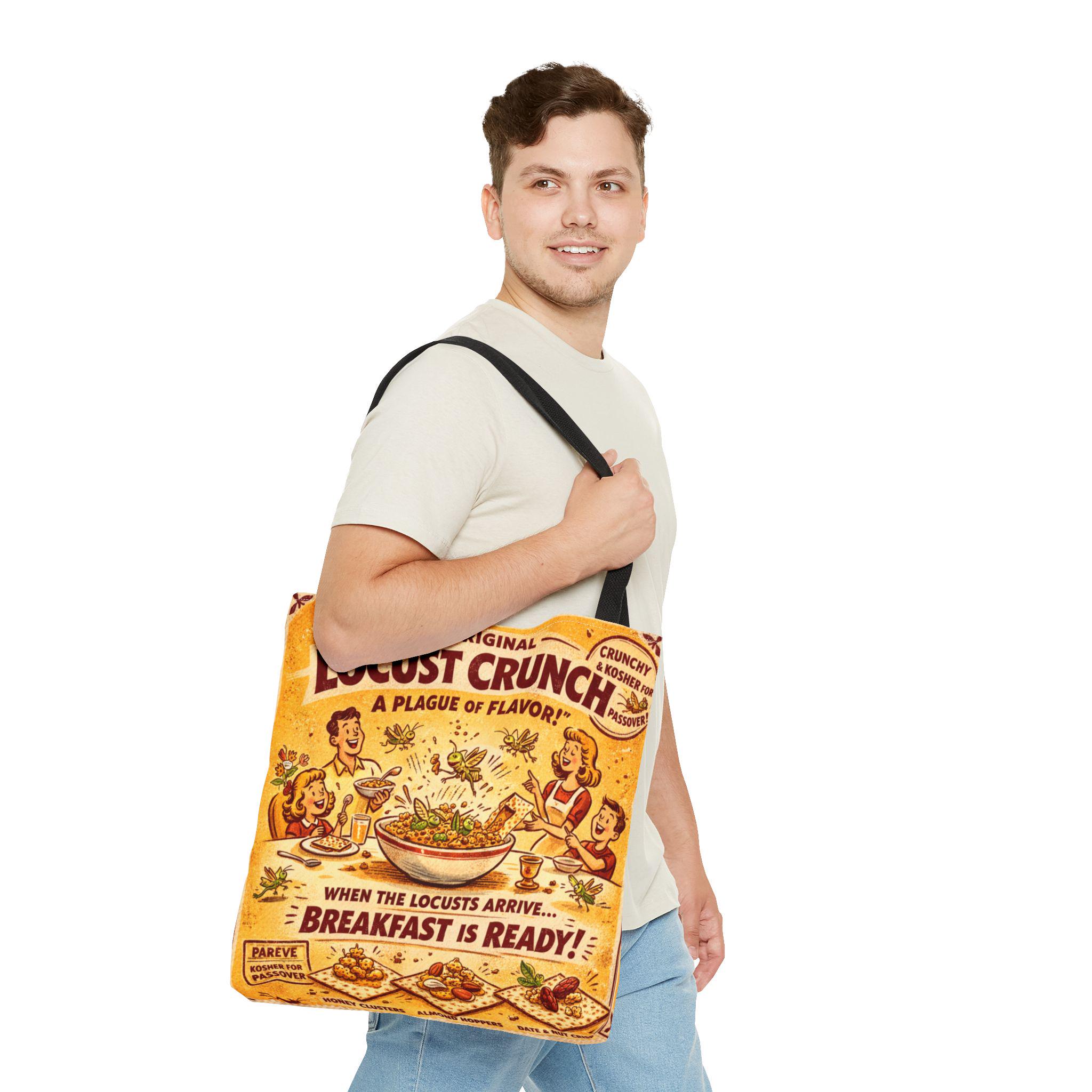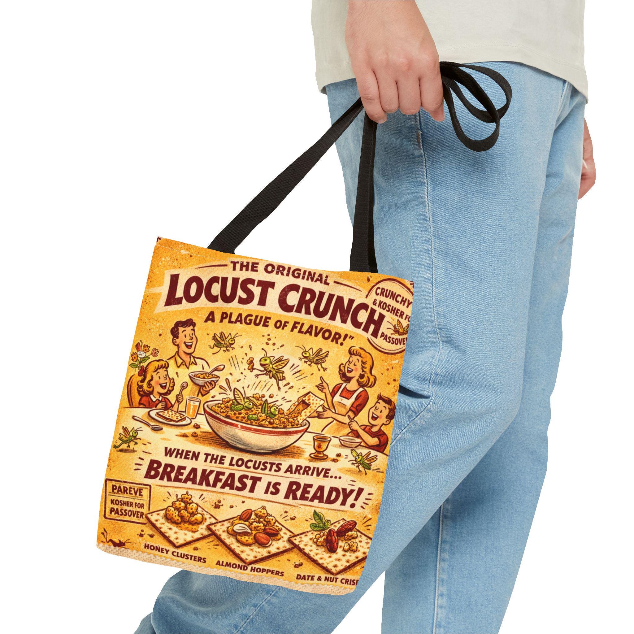 A vintage-style Passover tote bag featuring the playful “Locust Crunch” cereal ad — a retro Pesach market bag for matzah lovers, Seder hosts, and nostalgic Jewish kitchens.