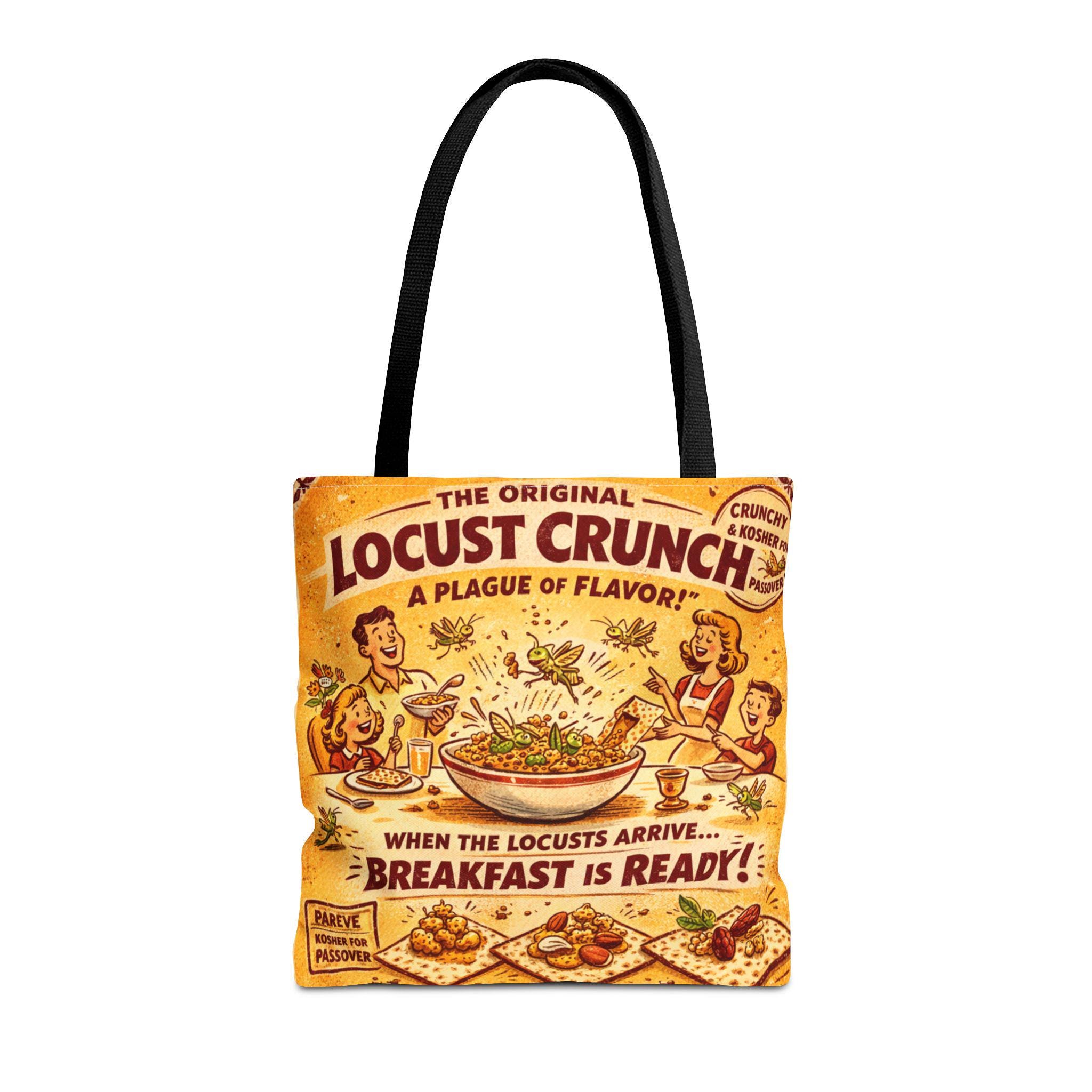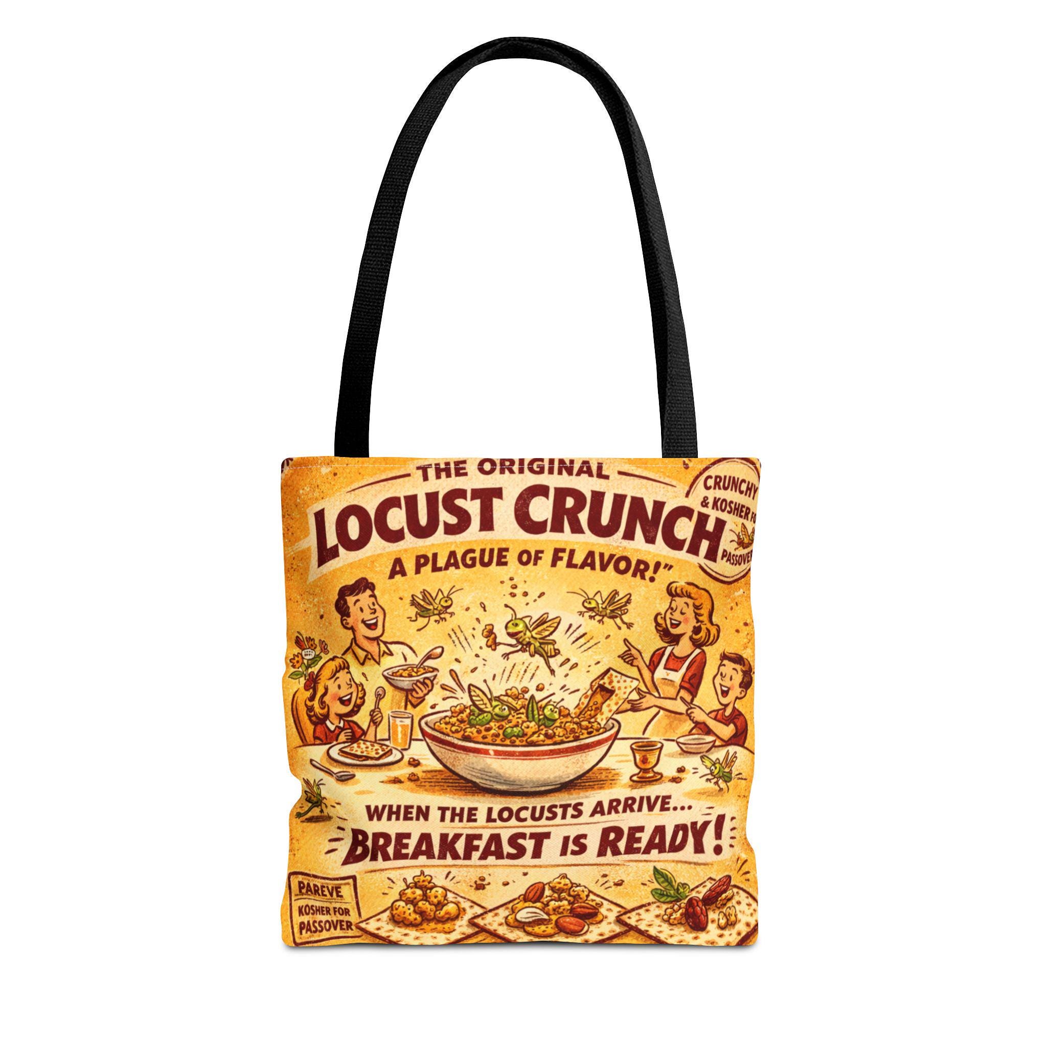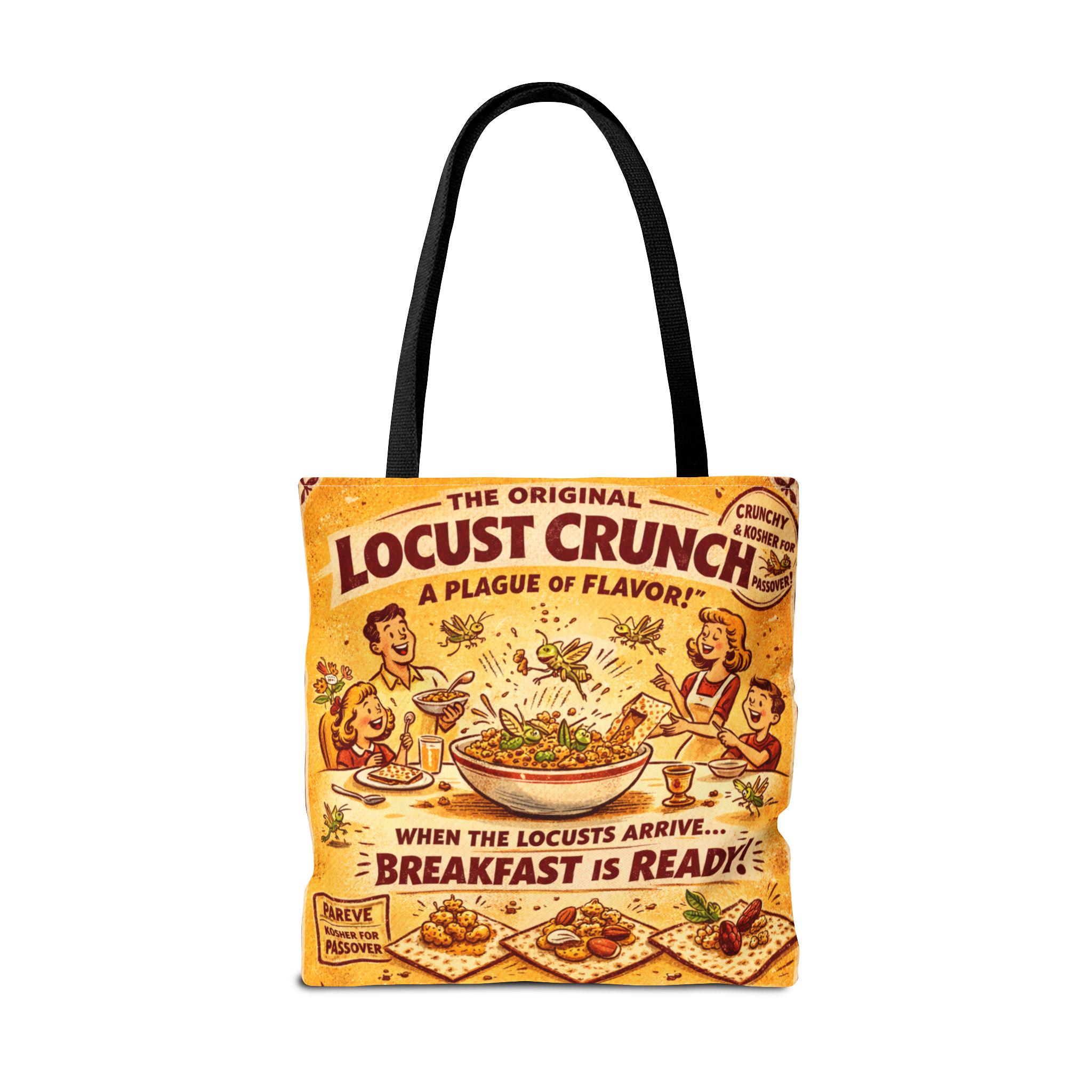 A vintage-style Passover tote bag featuring the playful “Locust Crunch” cereal ad — a retro Pesach market bag for matzah lovers, Seder hosts, and nostalgic Jewish kitchens.