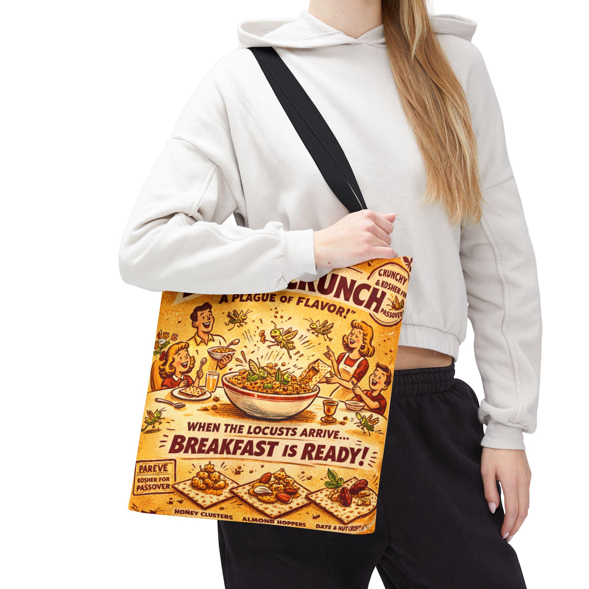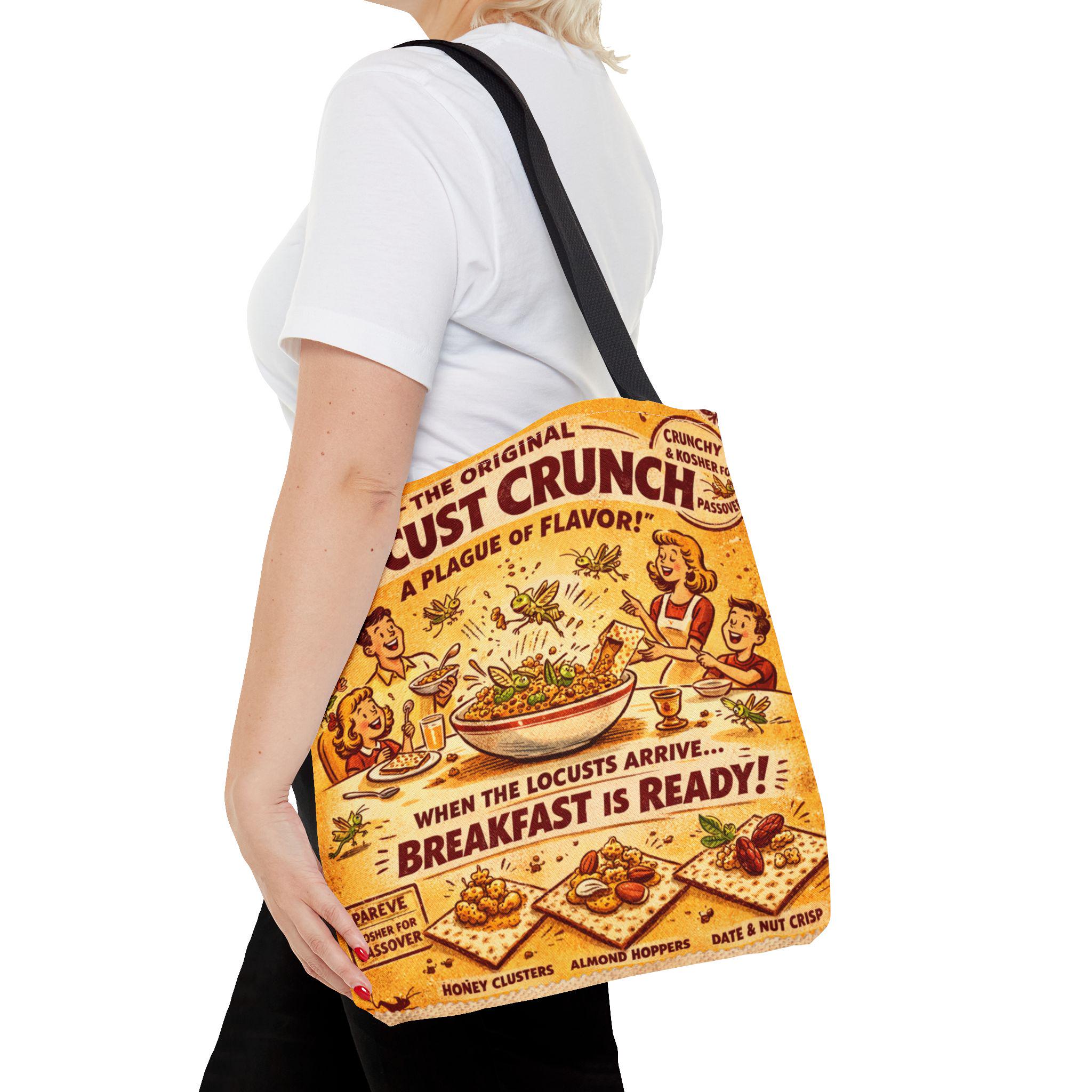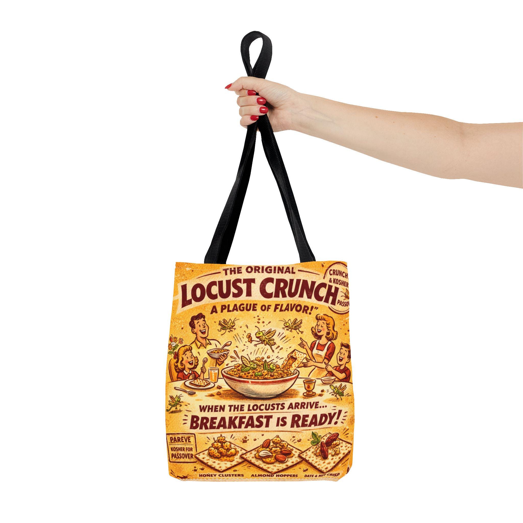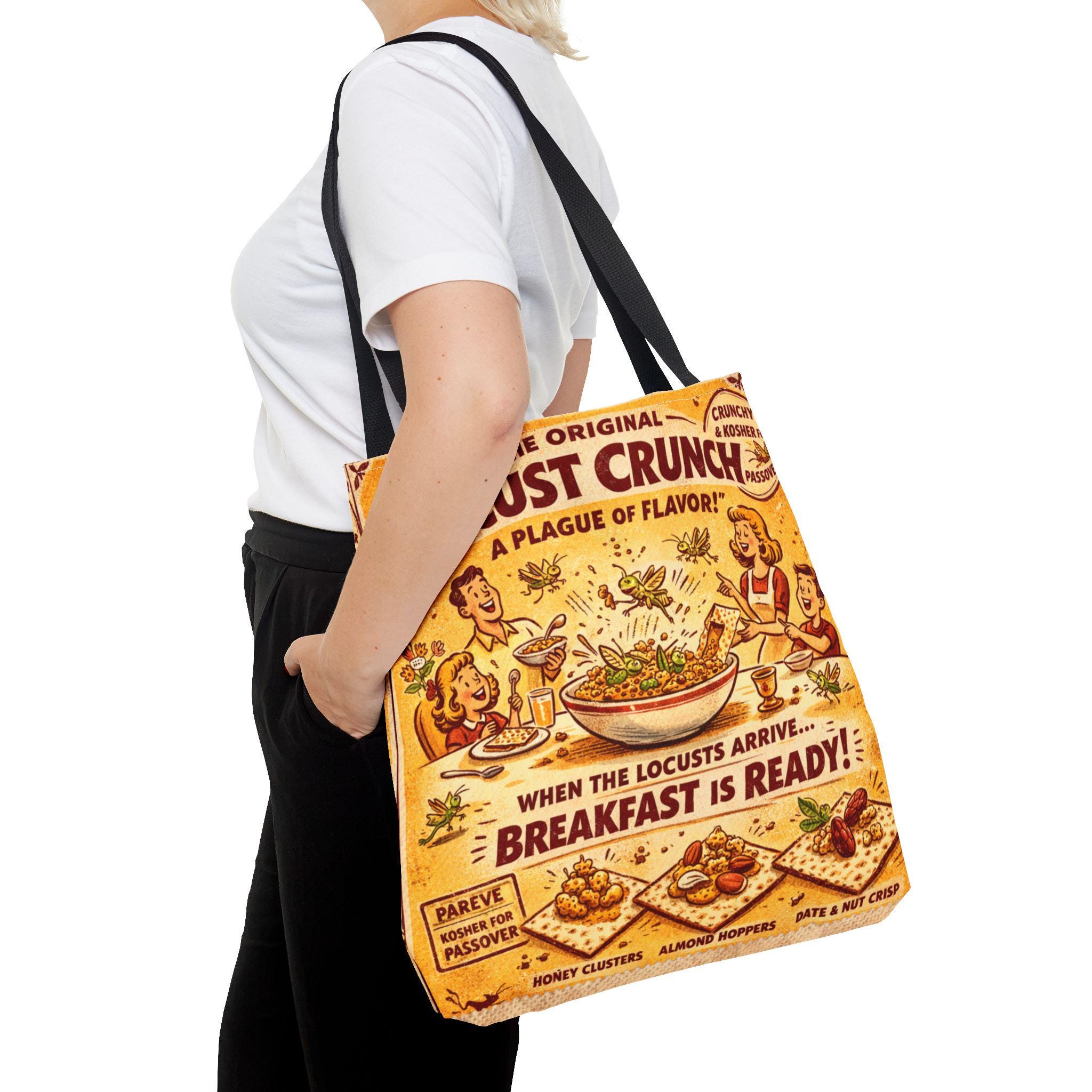 A vintage-style Passover tote bag featuring the playful “Locust Crunch” cereal ad — a retro Pesach market bag for matzah lovers, Seder hosts, and nostalgic Jewish kitchens.