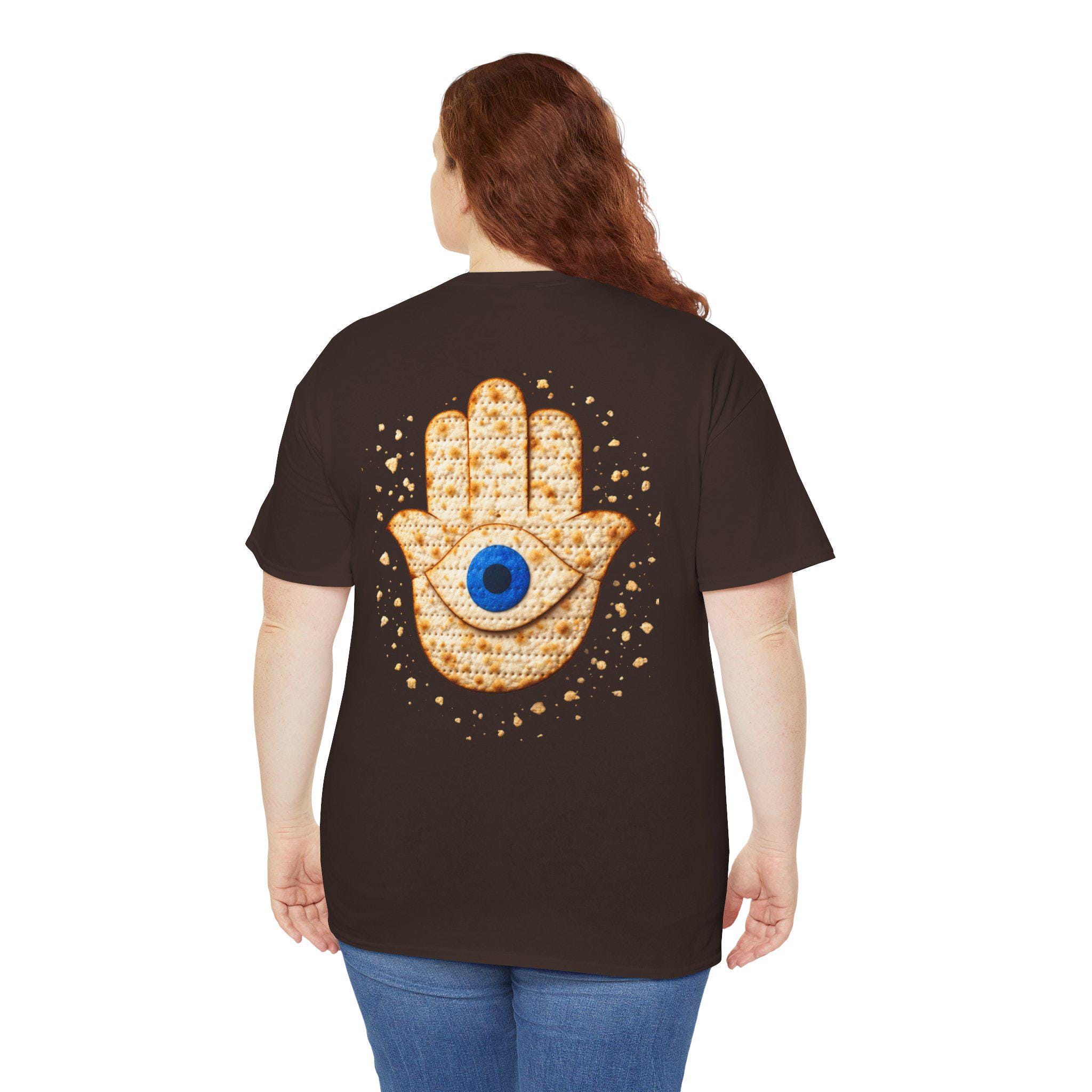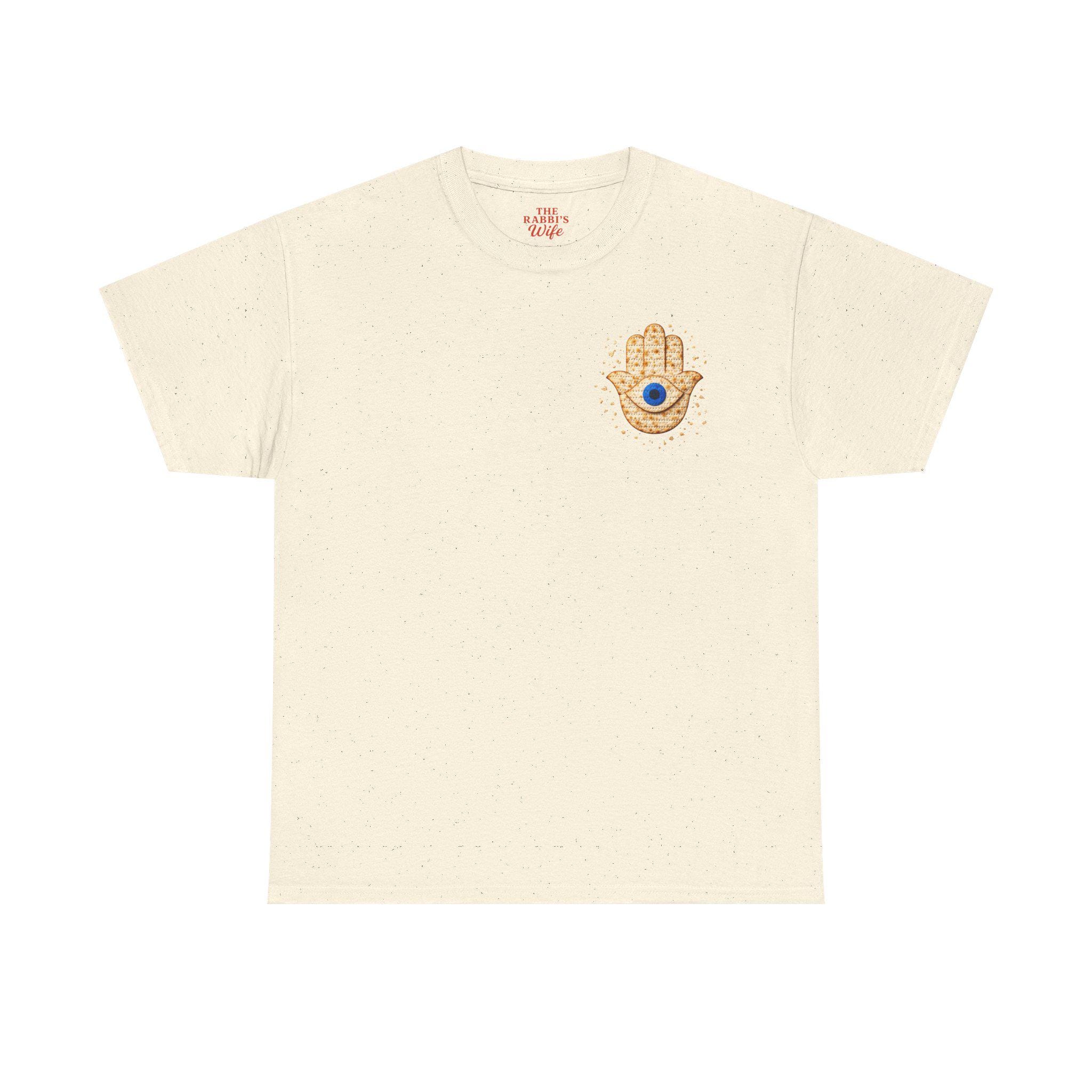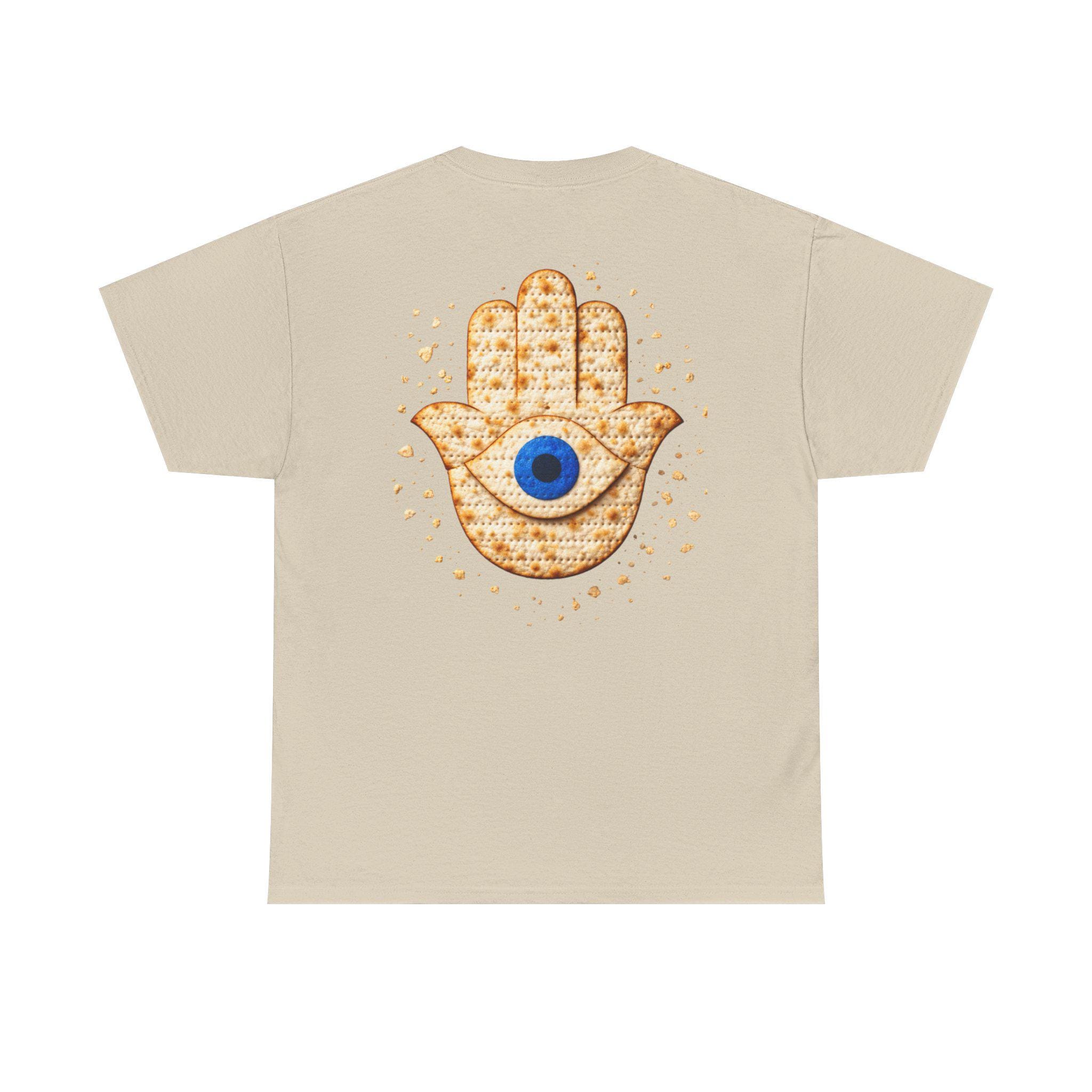 A modern matzah hamsa evil eye T-shirt designed for Passover and everyday Jewish pride. This meaningful Jewish holiday tee blends the protective symbolism of the hamsa and evil eye with the familiar texture of matzah for a design that feels both stylish and connected to tradition.