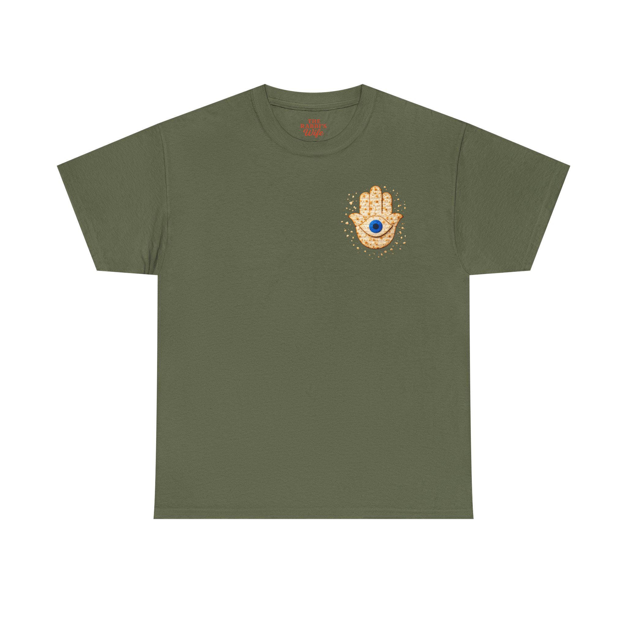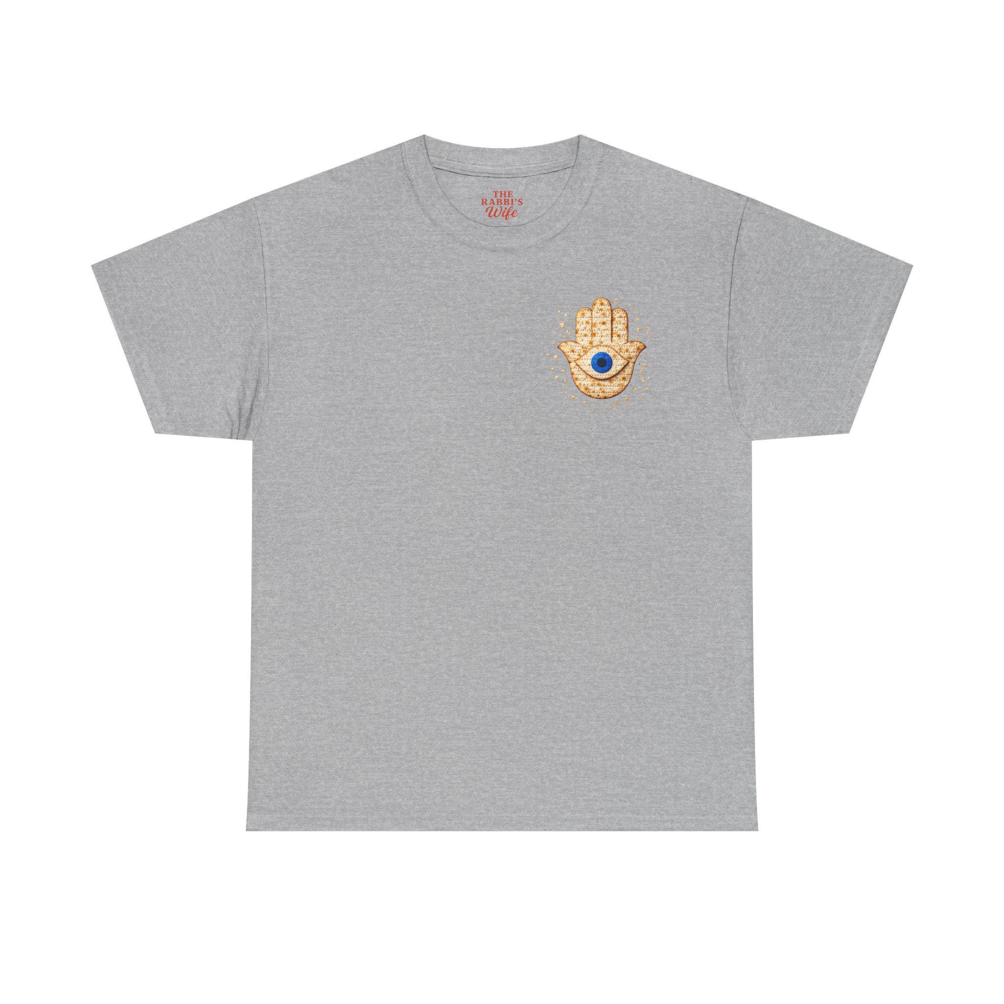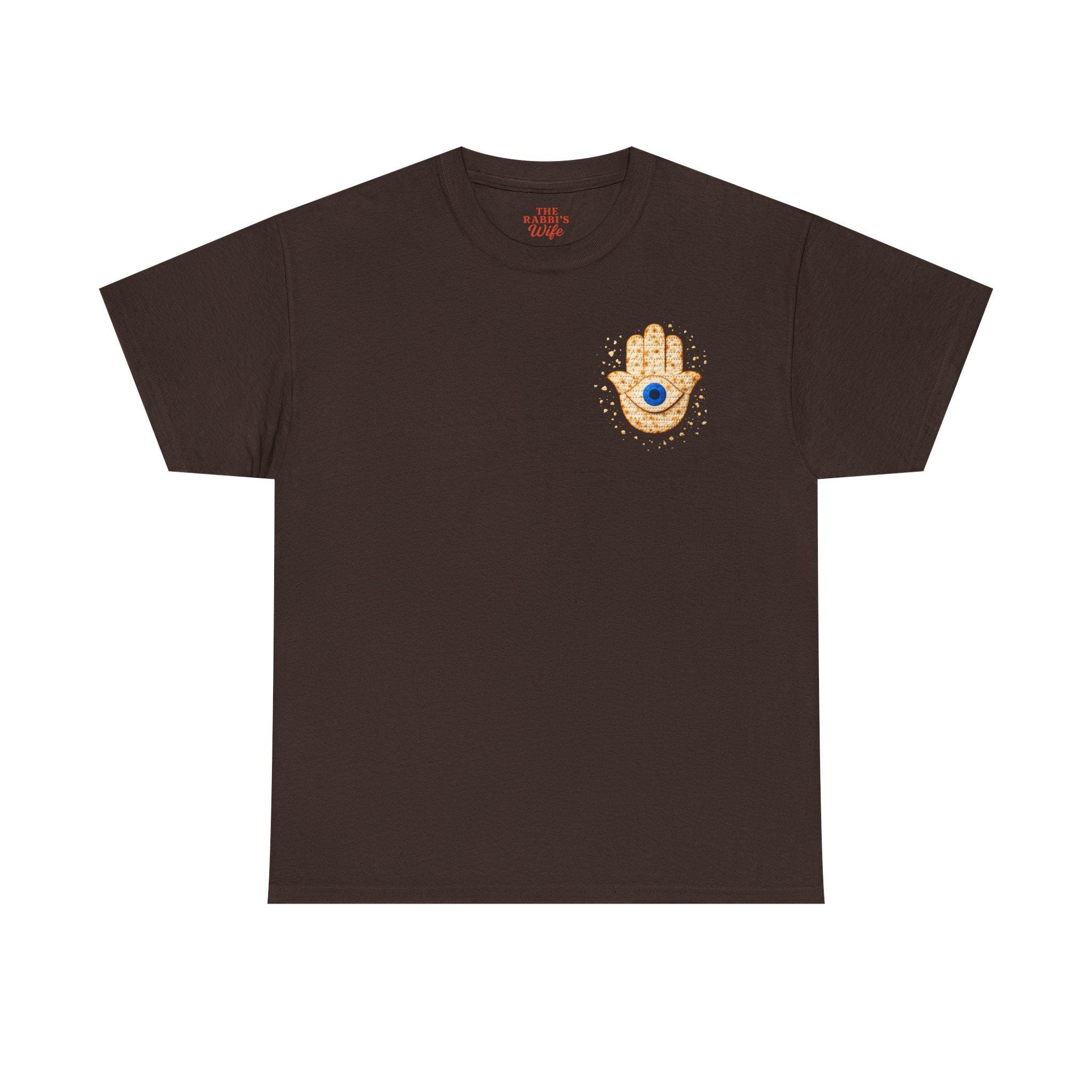 A modern matzah hamsa evil eye T-shirt designed for Passover and everyday Jewish pride. This meaningful Jewish holiday tee blends the protective symbolism of the hamsa and evil eye with the familiar texture of matzah for a design that feels both stylish and connected to tradition.