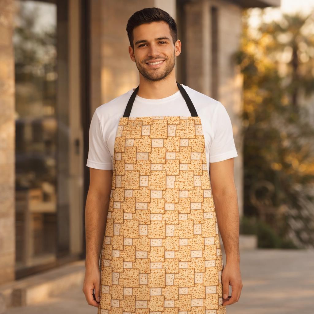 A Passover matzah apron designed for festive Pesach cooking and Seder meal preparation. Perfect for Jewish home cooks, hosts, and anyone who loves meaningful modern Judaica in the kitchen.