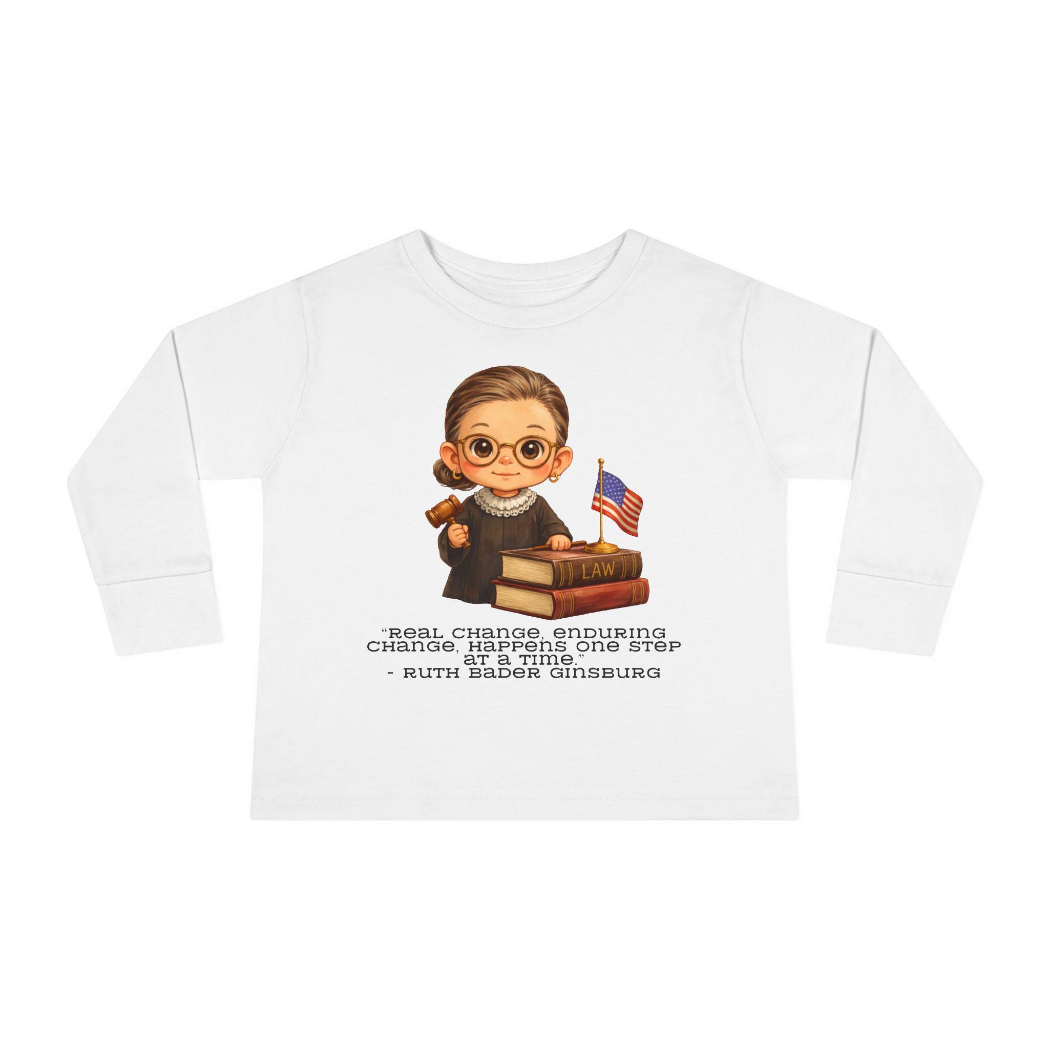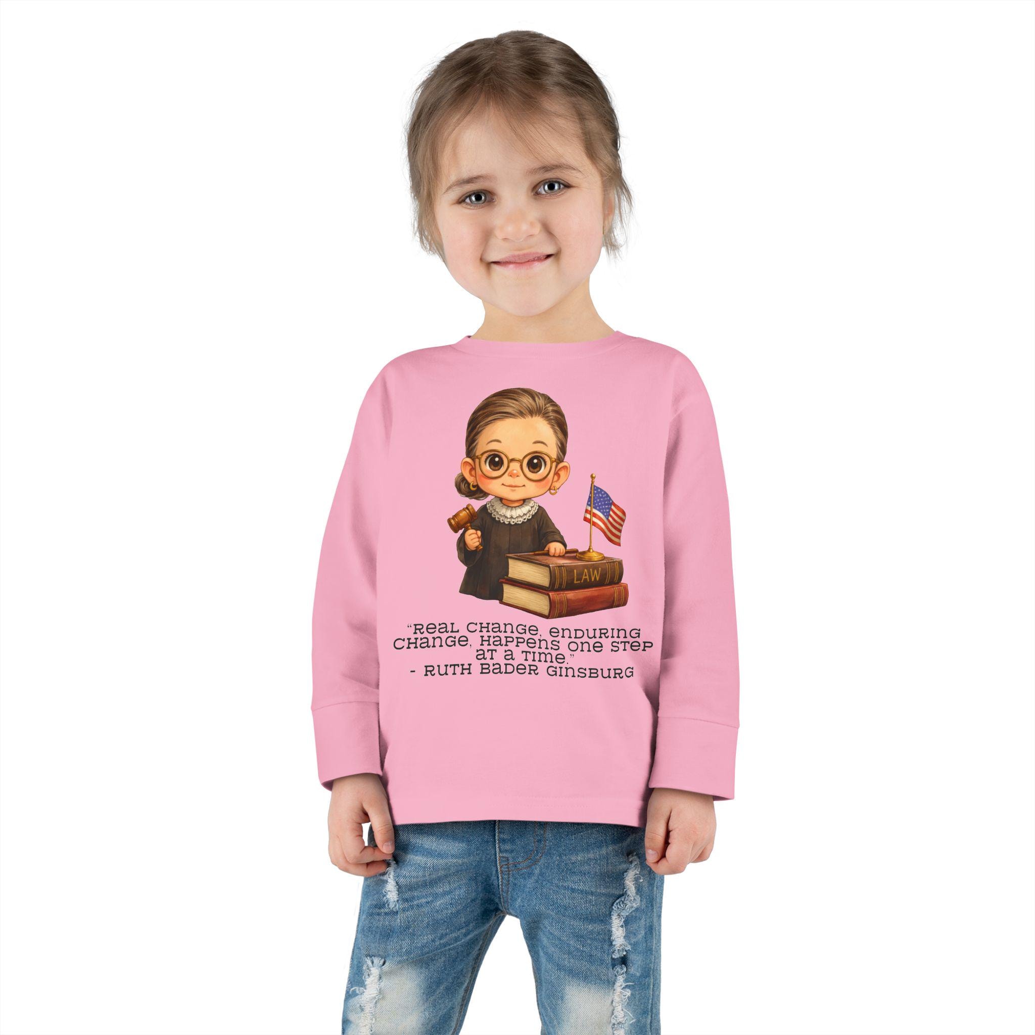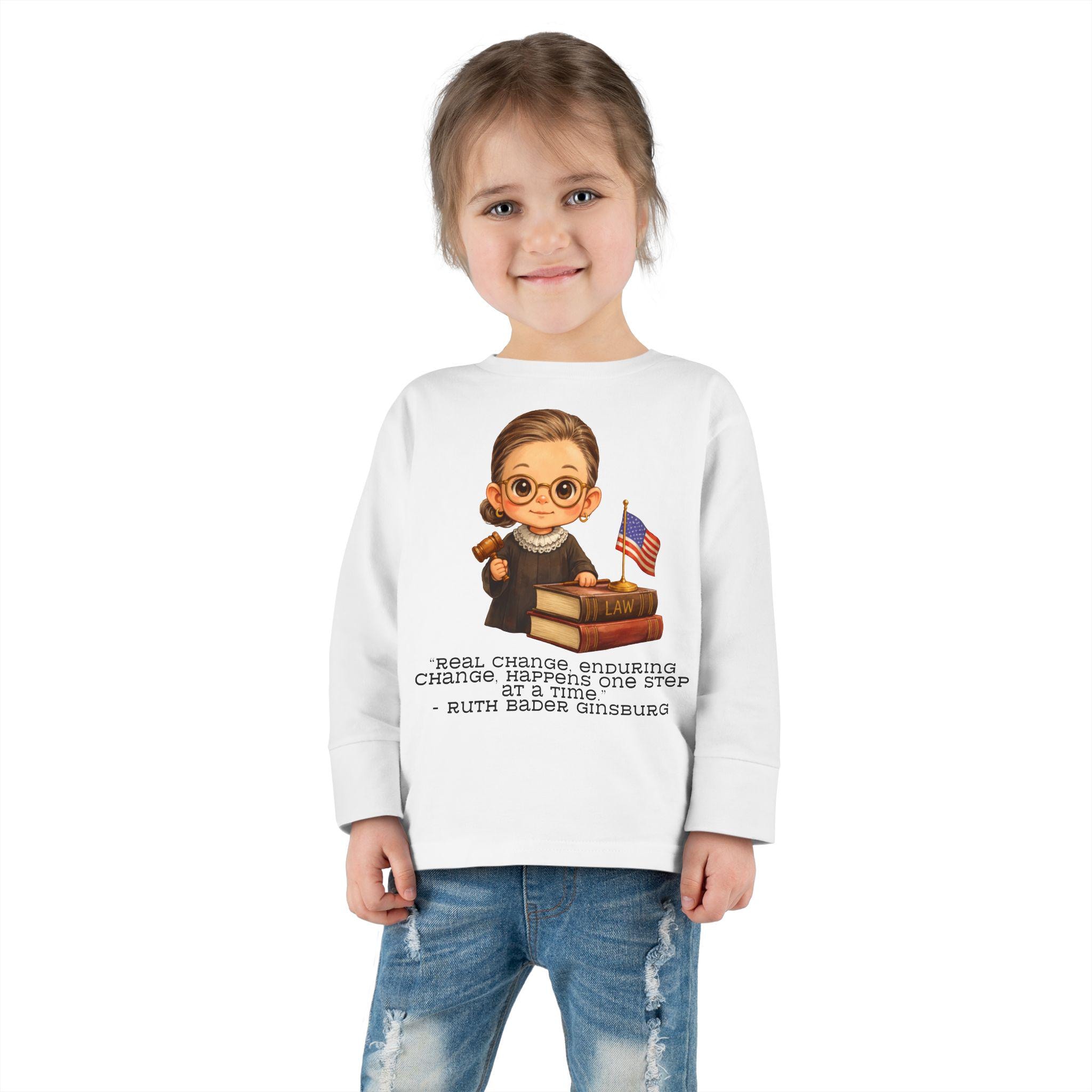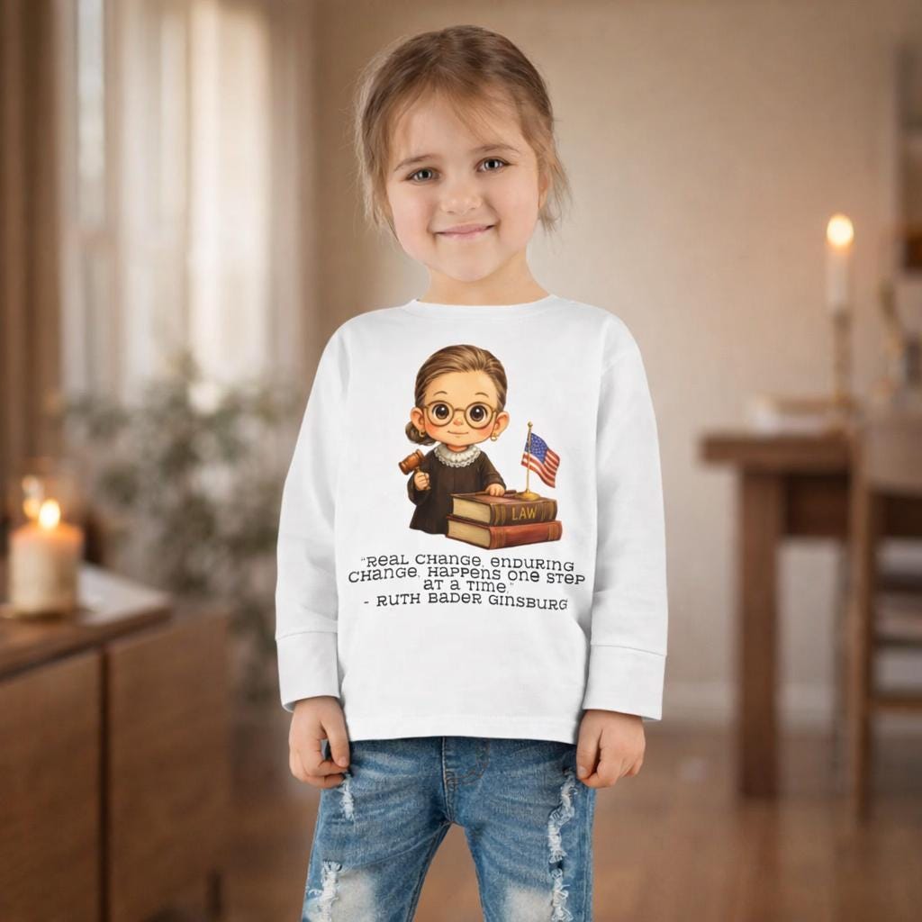 A Ruth Bader Ginsburg kids shirt celebrating courage, fairness, and determination. This RBG kids tee features her powerful message: “Real change, enduring change happens one step at a time.”