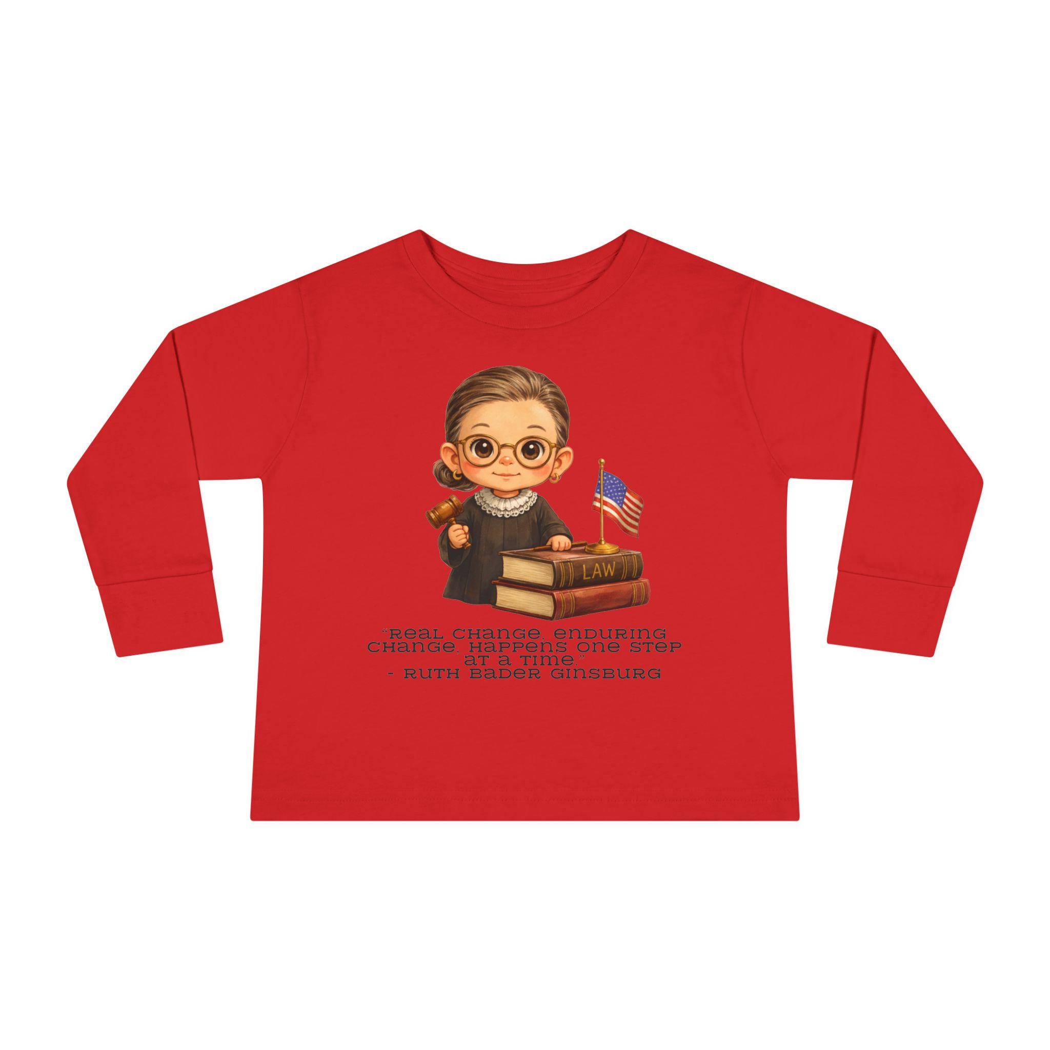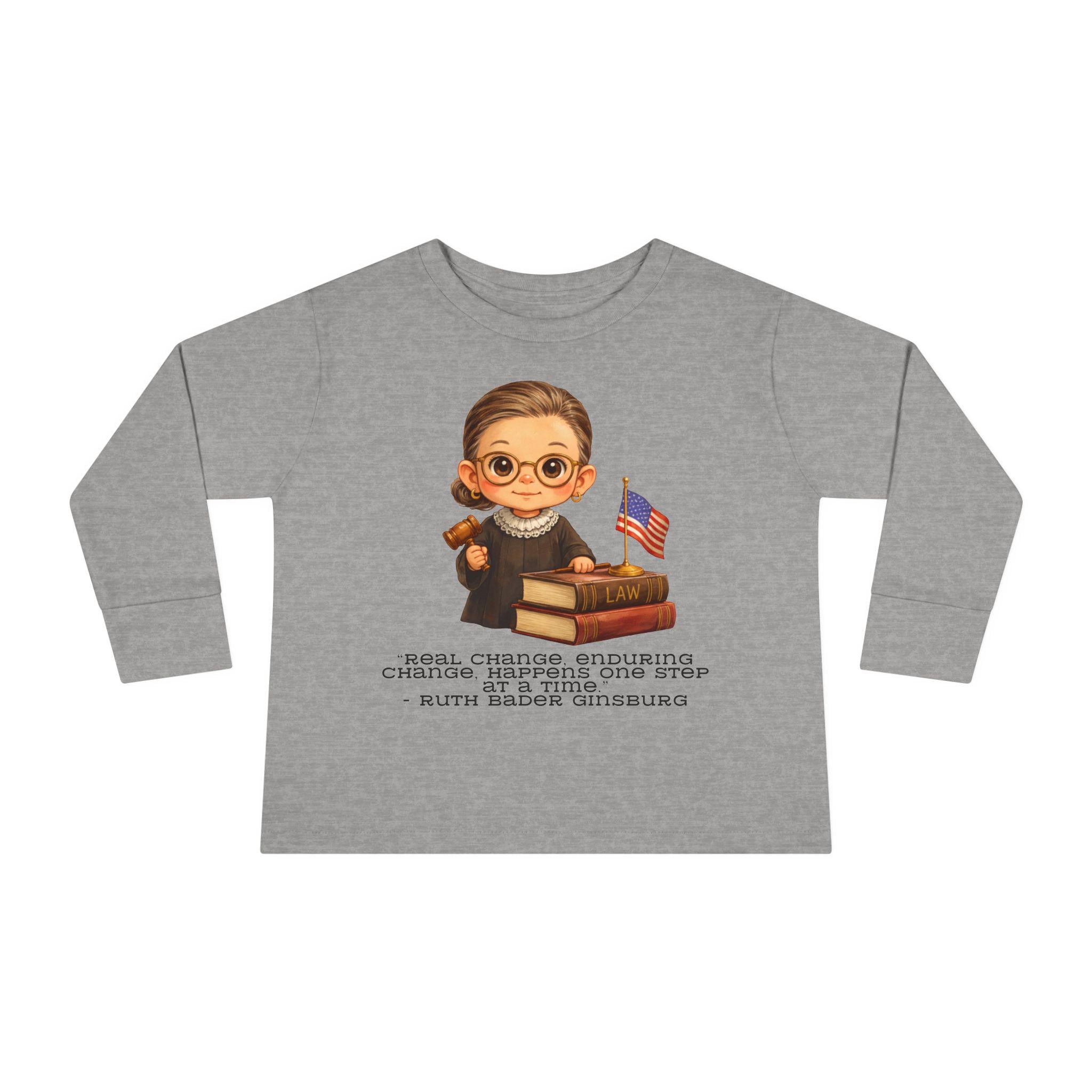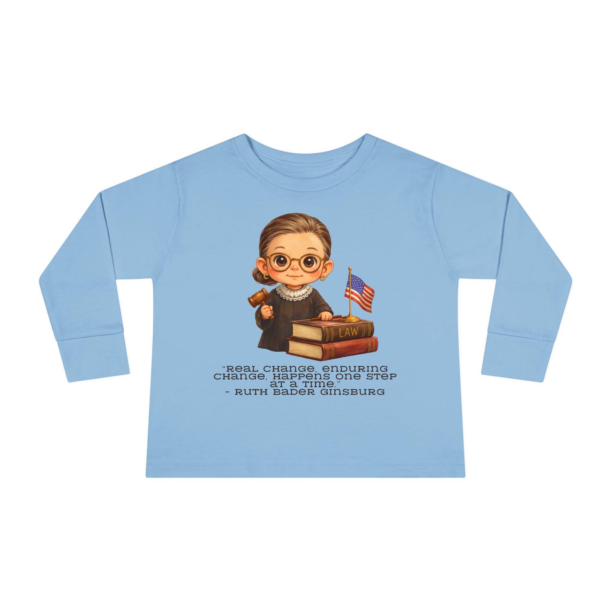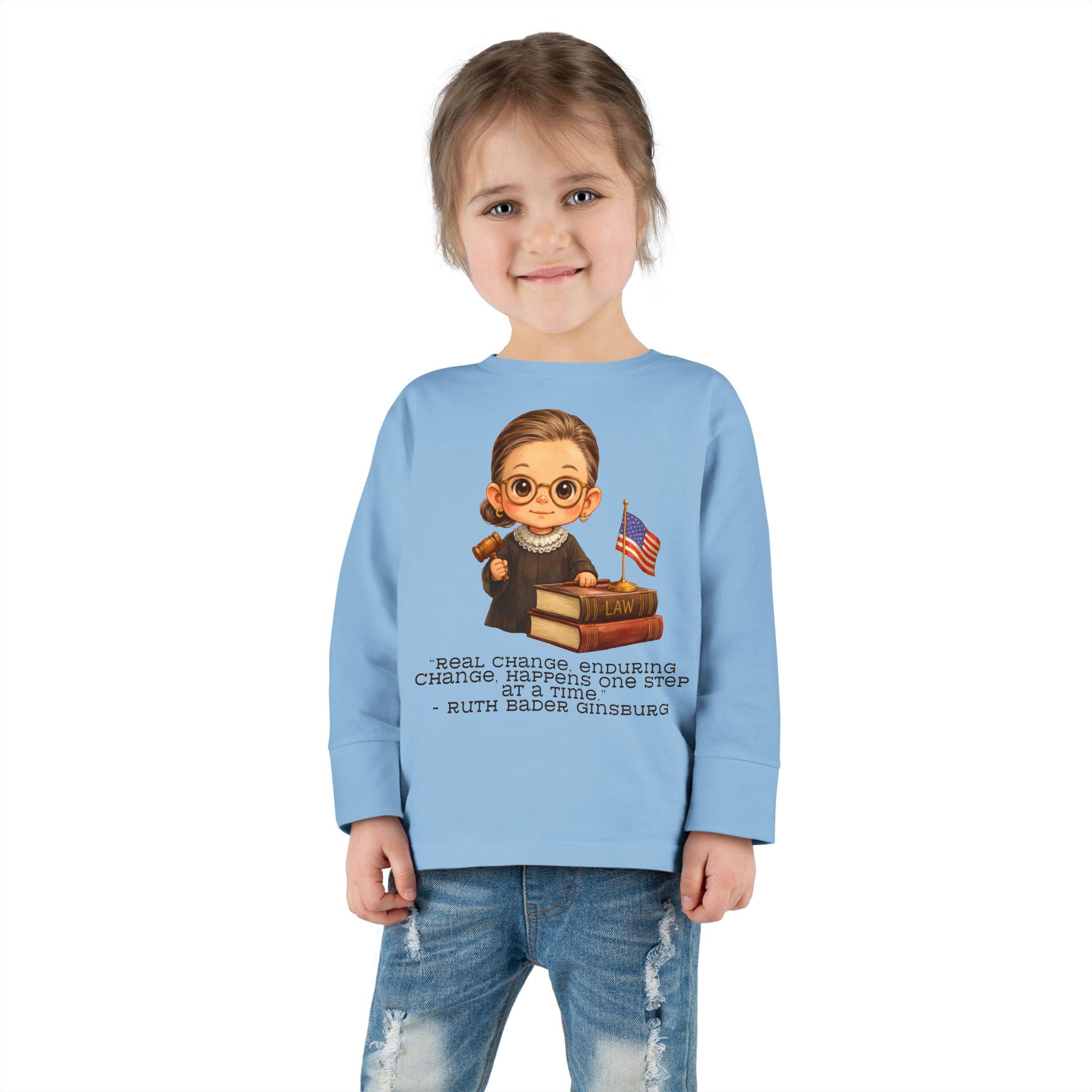 A Ruth Bader Ginsburg kids shirt celebrating courage, fairness, and determination. This RBG kids tee features her powerful message: “Real change, enduring change happens one step at a time.”