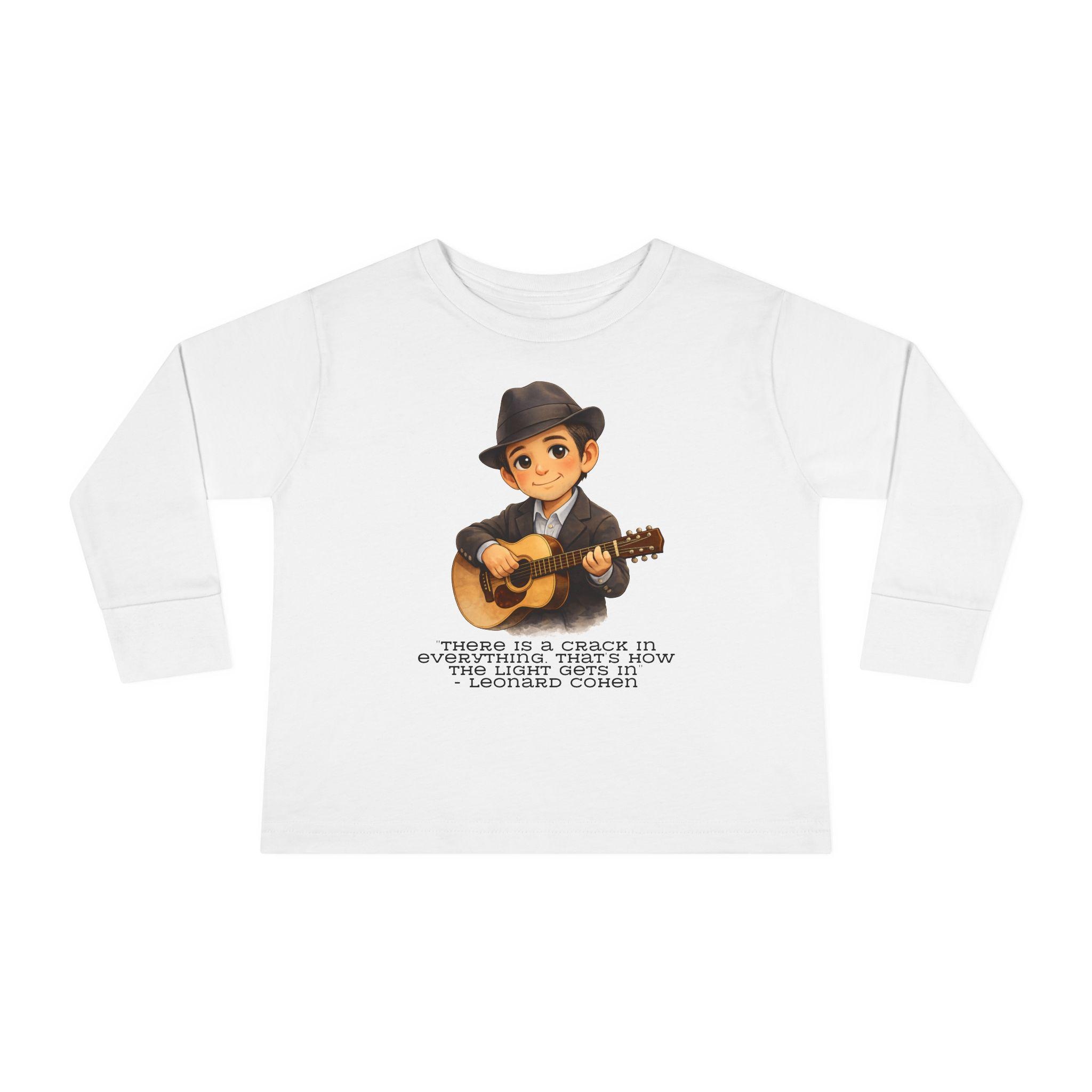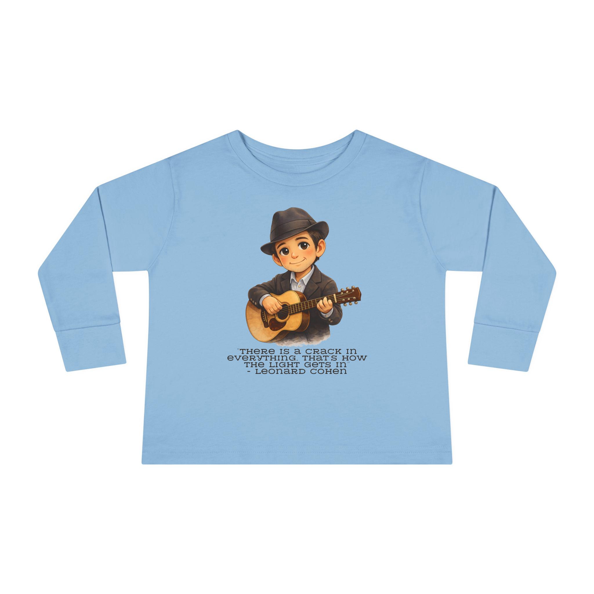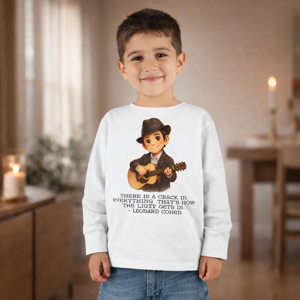 A Leonard Cohen kids shirt celebrating music, poetry, and thoughtful Jewish creativity. This Jewish music legend kids tee features the powerful line: “There is a crack in everything. That’s how the light gets in.”