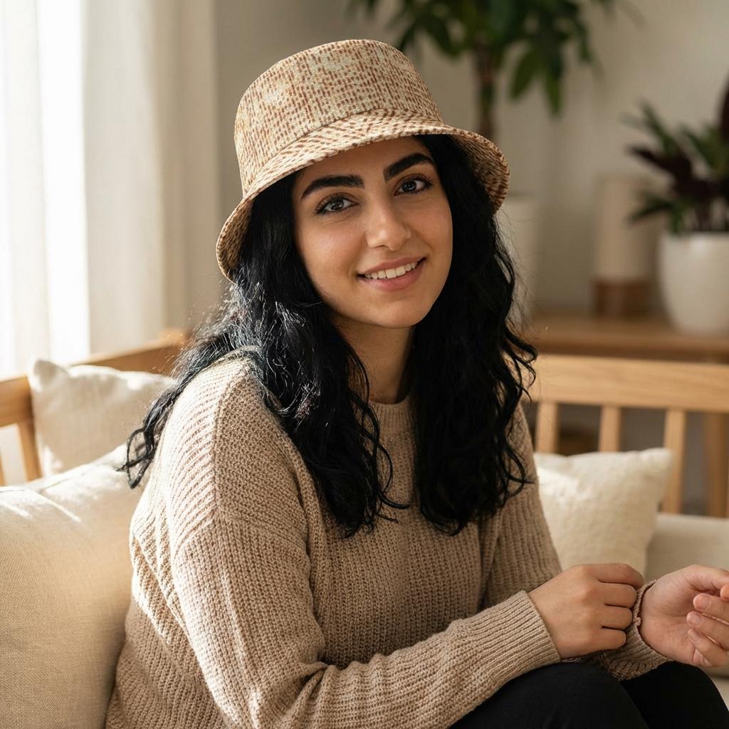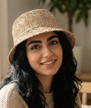 This soft, woven look bucket hat brings a warm, tactile vibe to sunny days, holiday gatherings, and festival moments. The matzah inspired texture in sandy, natural tones creates a lived in, understated aesthetic that pairs effortlessly with neutral wardrobes and outdoor settings.